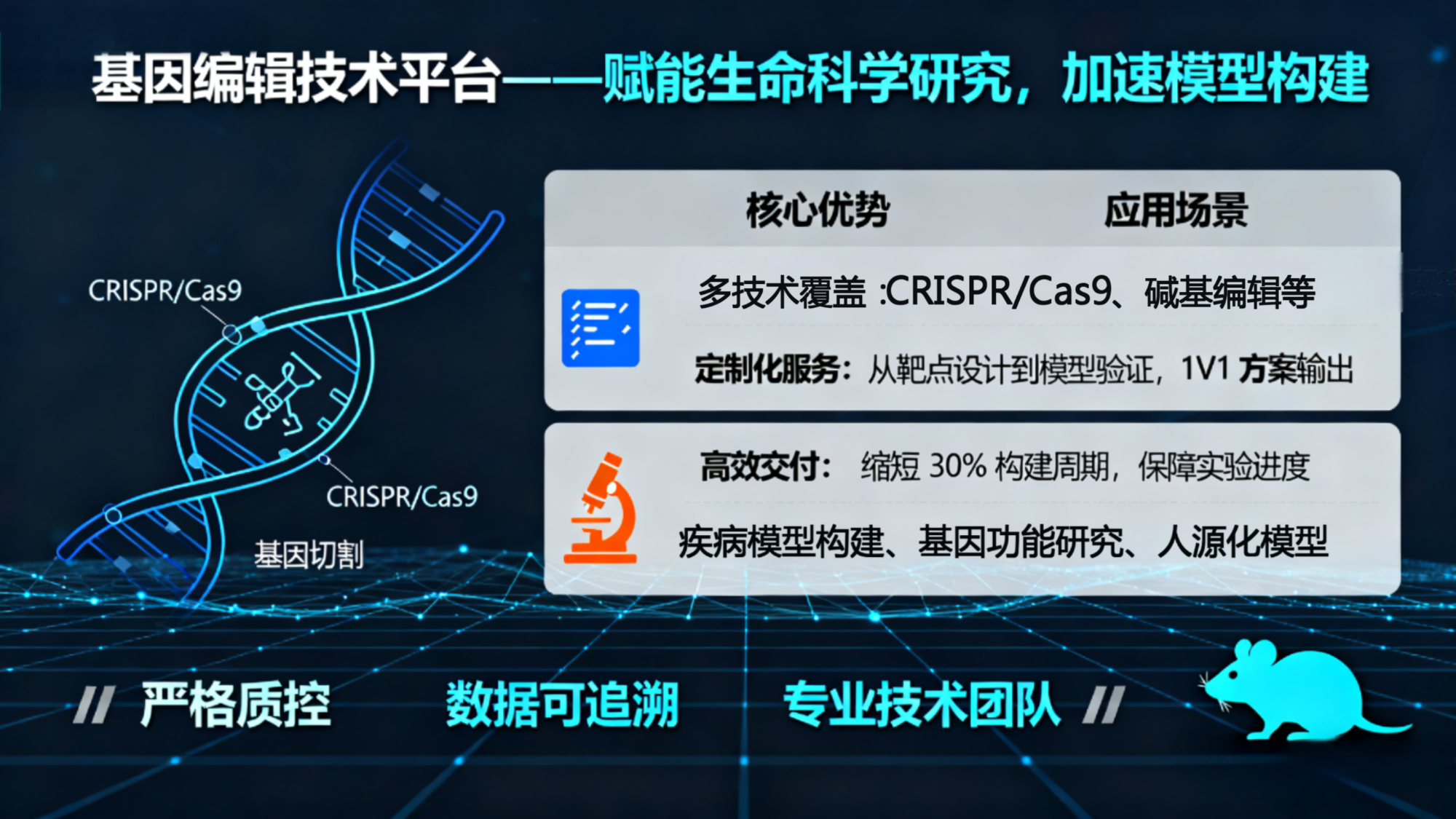 基因編輯模型:提供CRISPR/Cas9等先進基因編輯技術(shù)定制的小鼠基因敲除、敲入、點突變模型,精準模擬人類遺傳性疾病。